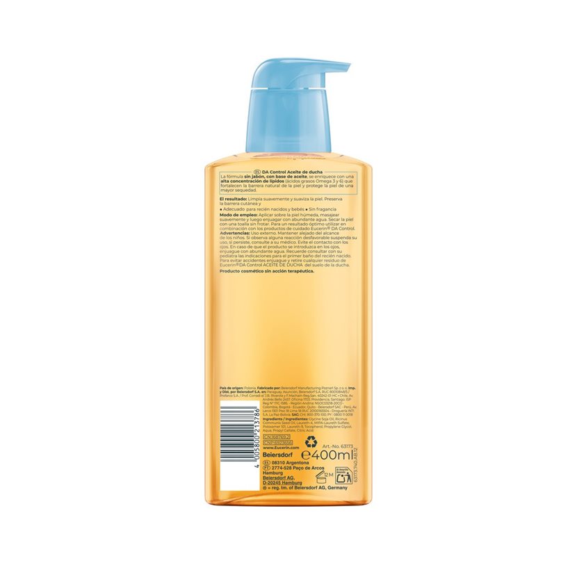 Eucerin DA Control Aceite de Ducha no contiene jabón y está enriquecido con una alta concentración de aceites Omega-3 y Omega-6 para limpiar y calmar suavemente la piel sensible. El lavado corporal alivia el picor y estimula la barrera natural de la piel. Incluso con un lavado regular, la piel está protegida de una mayor sequedad y picor.