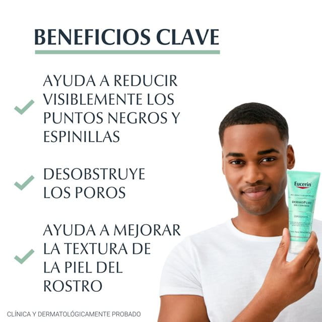 Eucerin DermoPURE Exfoliante, libre de aceites y con Ácido Láctico, elimina impurezas sin resecar la piel y es apto para el rostro y cuerpo. La acción exfoliante de las micropartículas naturales actúa contra las células muertas de la piel, una de las principales causas de los puntos negros y granitos, y limpia suavemente la piel y remueve el maquillaje.
