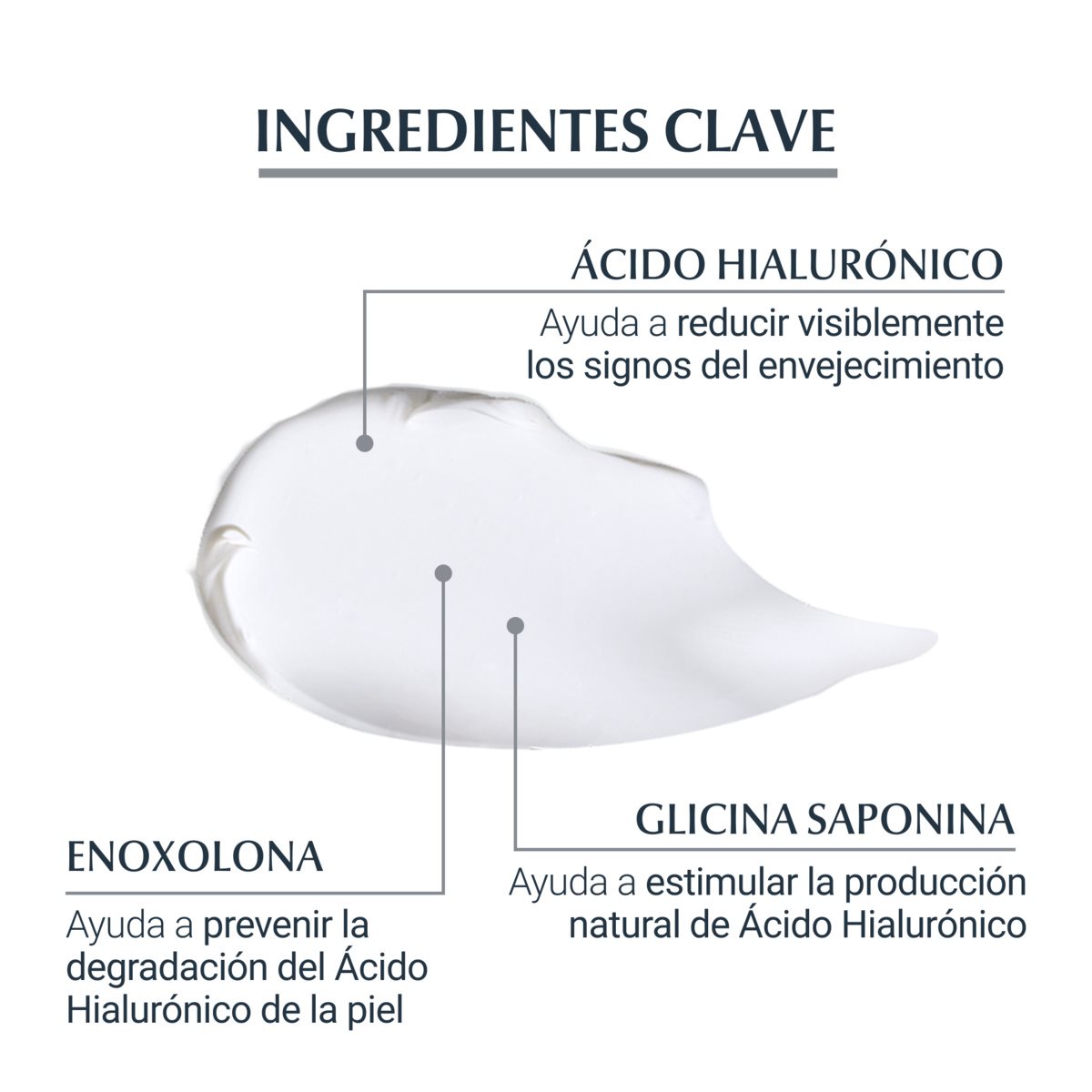 La mezcla única de Eucerin de Ácido Hialurónico de alto y bajo peso molecular, Glicina Saponina y Enoxolona, ofrece un enfoque específico para ayudar a rellenar visiblemente incluso las arrugas profundas. El Ácido Hialurónico de alto peso molecular mejora la hidratación y suaviza las capas más externas de la piel, mientras que el Ácido Hialurónico de bajo peso molecular, que es 40 veces más pequeño1, penetra más en las capas epidérmicas de la piel, donde se originan las arrugas profundas. El antioxidante Glicina Saponina, favorece la producción de Ácido Hialurónico en la capa dérmica, donde se forman las arrugas profundas, y protege de los radicales libres. La Enoxolona protege de la degradación al Ácido Hialurónico propio de la piel y el Dexpantenol apoya el proceso de regeneración de la piel durante la noche.